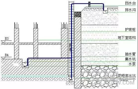 2.地下室排水。在肥槽内每50米设置集水坑一个,下雨时,在坑内放5台潜水泵(1台备用),将肥槽内的积水及时抽送至坑上的排水沟内。汇集到地下室集水坑内的雨水,同样用水泵抽到基坑外部的排水沟。利用场区内设置的沉淀池,将雨水经排水沟进入沉淀池沉淀后,再排入市政雨水管道。