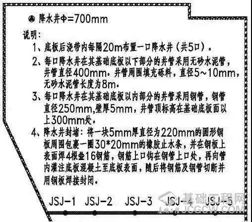 1.后浇带集水井排水。工程后浇带内共布置了5口降水井,在结构施工过程中,根据水位监测情况进行抽排。
