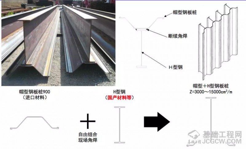 帽型+H 型工法,是将 H 型钢与具世界最大宽度(900mm)的帽型钢板桩焊接在一起,形成大截面 的组合式钢板桩的工法。