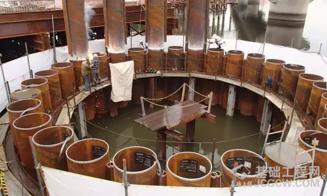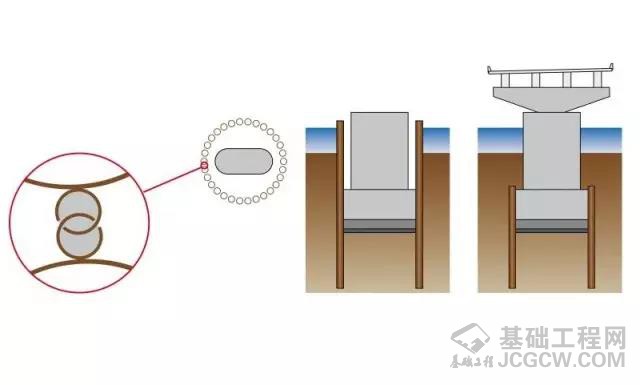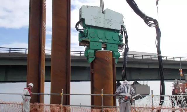 在爱知县高速路一座大桥的附近又修建了一座大桥,由于施工处地质比较差,此次围堰的施工采用了一种特殊的围堰方法-钢管桩围堰,管桩基础围堰直径为12米,它是由30根壁厚14毫米直径1米的钢管桩所组成。这次围堰施工并不是采用钢管桩与拉森钢板桩相组合的形式,而是在钢管桩两侧各焊上一条C型槽。这两条C型槽相扣非常紧凑,当围堰的所有钢管桩达到设计的深度后,可以把水和泥土等抽离出来后再筑承台及墩身,当桥墩完成后把超过承台上方的管桩部分割除掉。