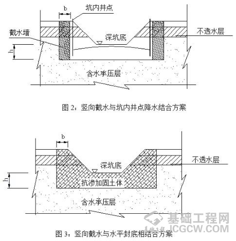 (3)土体抗渗加固截水法:当地下含水层渗透性较强,厚度较大时,可采用悬挂式竖向截水与坑底井点降水相结合(如图2)或采用悬挂式竖向截水与水平封底相结合的方案(如图3)。在土体开挖之前,对深基坑四周抗渗薄弱的土体进行抗渗加固。土体抗渗加固的方法有深层搅拌桩加固、粉喷桩加固、压密注浆加固及劈力注浆加固等方法。土体抗渗加固的水泥掺量可根据试验确定,一般浆喷深层搅拌的水泥掺量宜为被加固土重量的15%~18%;粉喷深层搅拌的水泥掺量宜为被加固土重量的13%~16%;注浆加固的浆液注入率一般为被加固土体重量的15%~20%,浆液配合比:水泥:粉煤灰:水玻璃=1:1:0.04。加固的范围(深度和厚度)可经过计算确定,被加固的土体具有一定强度和较高抗渗能力,形成一截水帷幕,截水帷幕的渗透系数不宜小于1.0×10-6cm/s,可保证深坑开挖时,不会出现流沙或管涌现象。当采用悬挂式竖向截水与水平封底相结合的方案时(如图3),应对坑底加固土体的抗浮稳定进行验算。