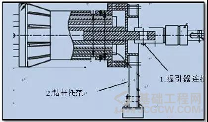 钻杆用枕木垫放一退出销轴,拿掉提引器一卸掉钻杆防十涉让位短筒和钻杆托架轴承圆盘连接处的螺栓,拿掉钻杆托架一拆除钻杆最内节末端的螺栓及挡板,档圈一 向前方(左)拉出最内节一依次向后(右)拉出其它杆节。