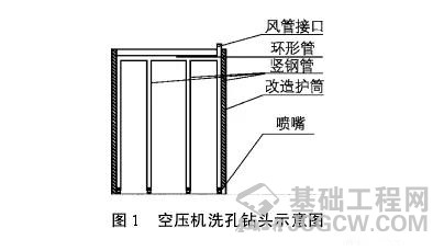 “清”即清渣洗孔。清渣可用正反循环、高喷或用洗井管空压机进行,清渣应根据地层确定泥浆质量和所用清孔设备,避免造成捞钻过程中二次塌孔事故的发生。利用空压机洗孔示意图如图1所示。