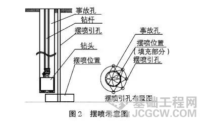 1、有些情况下,处理埋钻事故的关键是疏通孔底与钻头上部之间的通道,使钻头底部与上部形成连通器,避免活塞效应,即被称之为“透”。为了能够形成连通器, 一般在孔边打几个比事故孔深的孔,用高压旋喷进行摆喷,如图2所示。用于通路形成,转动动力头同时增加主绳提拔力,有可能将钻杆和钻头一起提出。有的处理 方案采用反循环钻机与扩孔钻头相结合。
