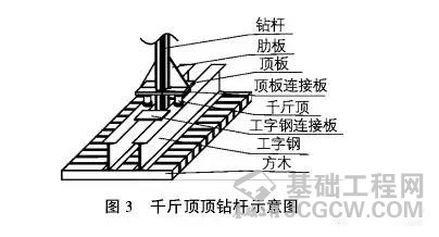 2、“顶”即用千斤顶钻杆,是处理埋钻最常用的力一法。用千斤顶需要有一个坚实的平台,并在钻杆上加焊千斤顶施力板,如图3所示。用3cm肋板与钻杆 焊接,顶板与肋板及钻杆焊牢,并将2块顶板连接。工字钢采用60 x 100cm规格,并用连接板连接。千斤顶控制系统应联动加压。一般钻杆上部连接的卡环或直销,其所能承受的极限载荷为180kN左右,在千斤顶联动加压至 150kN后,应逐步提高压力,并在每提高3到5kN压力后停滞1h左右,等待土层蠕变效应的发挥。加压的同时转动动力头。使用千斤顶的结果可能有几种: 一是钻头钻杆全部顶出;二是钻头顶盖或斗门破坏,钻杆连同破坏的钻头顶出;三是钻杆内杆卡环或直销顶断,内杆和钻头留在孔内;四是钻杆从有旧裂痕处破裂, 部分钻杆和钻头留在孔内。