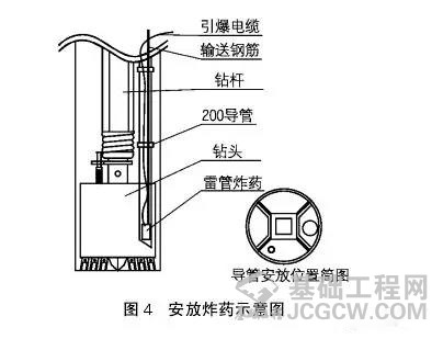 3、“炸”即孔底爆破。如果洗孔后还不能提起,可以利用炸药定位爆破将钻头炸坏,提出钻杆,如图4所示。一般利用这种方法处理事故的基桩孔都已接近设计深度,经设计校验能够达到承载力要求,爆破后可直接灌注。