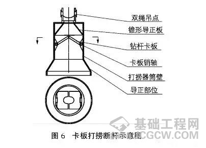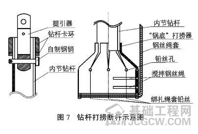 5、打捞钻头或钻杆可以用“套、卡、钩”的力一法。如果是钻杆内心断裂,连钻杆带钻斗遗留在孔内,扩孔和洗孔清渣后,可以下潜水员套住钻杆钻具。当埋 深较浅时也可用钢筋支架套取钻杆,如埋钻较深时扩孔清理沉渣后可用卡板打捞器进行打捞,卡板打捞器如图6所示;当沉渣较厚时,也可制作套取器,如图7所 示,将提引器用自制钢销固定在三节钻杆上,将锅底形打捞器也固定在同节钻杆上。打捞器直壁高度应大于钻头力一头高度,以保证其内所焊的钢丝绳能够清渣到 位。清渣时钢丝绳套可固定在动力头上,以保证绳套与钻杆同步。