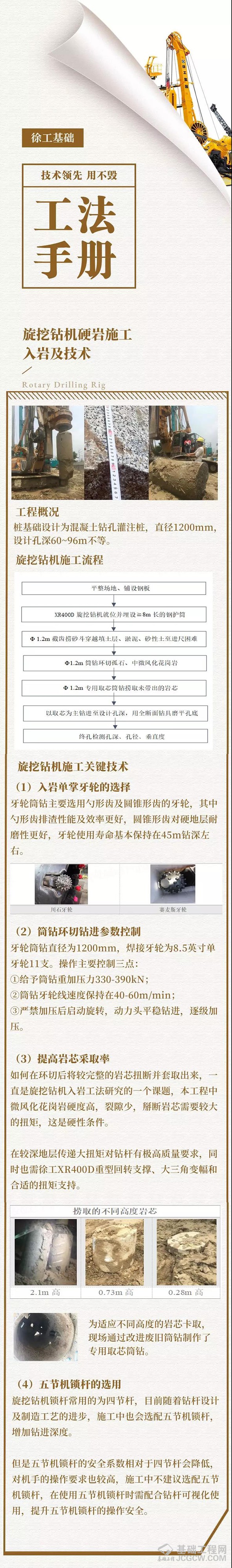 旋挖钻机钻进深层坚硬岩对设备、钻具和操作人员都是一个考验,每个工程项目的地质情况和设计要求都千差万别,采用的机型也不尽相同。若在单轴抗压强度超过120MPa,深度大于80m的花岗岩地层取得理想的施工效率和效益,必须有完善的入岩工艺及技术。