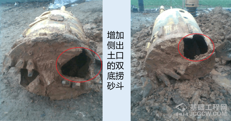 对于托底打滑,钻进时,钻渣吸水后变成粘性很大的塑状黏土物质糊在钻齿和钻底上,是钻齿失去了切削作用而无法继续钻进。此时可在双底捞砂斗两侧增加侧出土口。