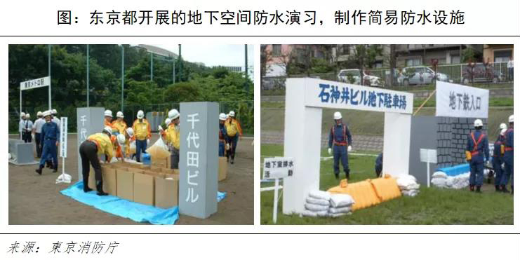国土交通省先后制定发布了《地下空间淹没对策制定指南》、《地下空间防淹没设备设施使用指南》、《地下街•地下铁防灾工作计划》、《地下空间安全避难计划制定指南》(依据《海啸防灾区建设法》制定)等一系列指南;东京都政府也发布了《东京都地下空间淹没对策指南》。