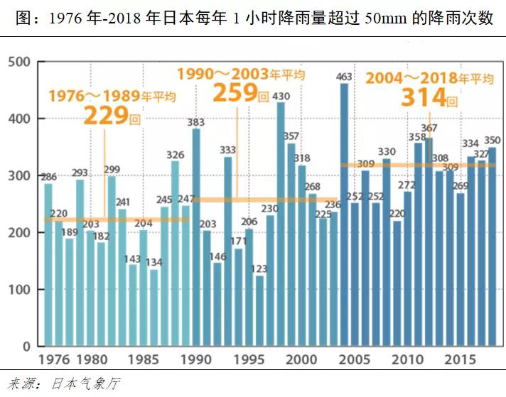 日本原本就是暴雨多发的国家。据统计,东京年平均降水量为1543毫米,是世界平均水平的2倍[2]。尤其近年来,随着气候变化的加剧,日本大规模降雨的现象显著增多。进入21世纪,1小时降雨量超过50mm的降雨次数大幅度增加,2004年-2018年年均发生次数是1976年-1989年的1.4倍。