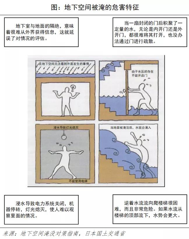 二是灾害发生迅速、反应时间短。由于地下空间与地上空间隔绝,处在地下空间的人员对地面情况掌握较少,在主观判断上容易出现迟缓。一旦出现出入口被淹的情况,地下空间会迅速被淹没。此时如果水深超过一定水平,还会存在因水压差别造成无法开门的情况。