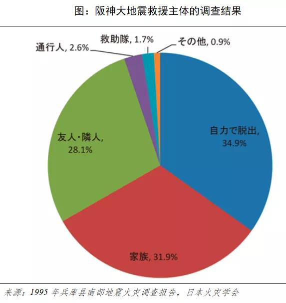 1995年阪神大地震救援主体的调查结果显示,34.9%的人依靠自救获生、31.9%的人依靠家人获救、28.1%的人依靠朋友和邻居获救,依靠救援队获救的仅有1.7%[4]。