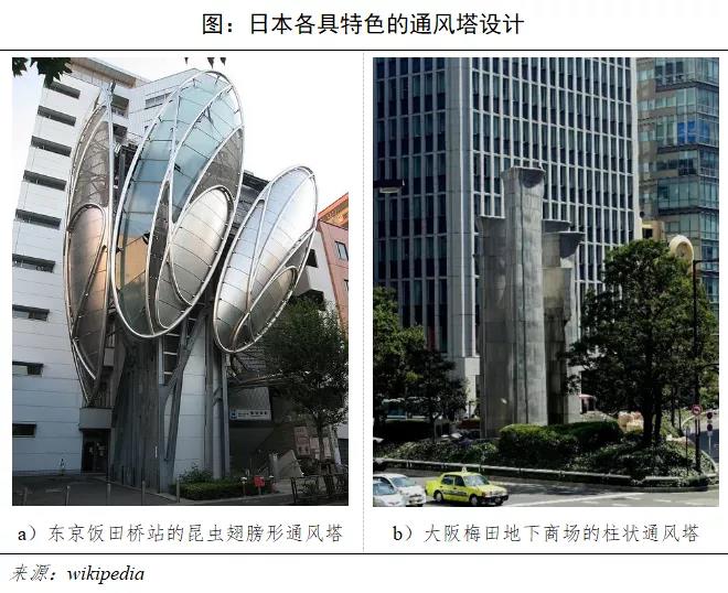 二是设置通风塔。通过建造通风塔来抬高通风口位置,并将通风口设置在通风塔侧面,以此来达到防水的效果。值得一提的是,日本的建筑师还对通风塔进行了各种各样的设计,使其不仅具备通风、隔音的效果,还成了城市中一处处别具特色的景观。