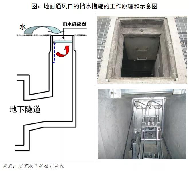 一是设置防水感应和挡水装置,主要作为地面通风口的挡水措施。通常在通风口处设置防水感应器,当感应器感应水量达到一定标准时会自动拉起防水门、封闭通风口,阻挡洪水进入地下空间。东京地铁951个地面通风口有907个都安装了这一装置。