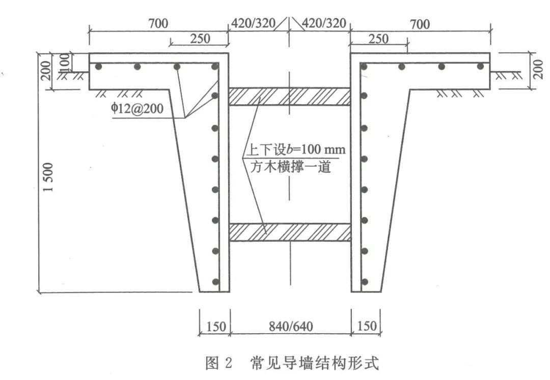导墙的位置、尺寸准确与否直接决定地下连续墙的平面位置和墙体尺寸能否满足设计要求。导墙间距应为设计墙厚加余量(4~6cm),允许偏差±5mm,轴线偏差±10mm,一般墙面倾斜度应大于1/500。导墙的顶部应平整,以便架设钻机机架轨道,并作为钢筋笼、混凝土导管、结构管等的支撑面。导墙后的填土必须分层回填密实,以免被泥浆掏刷后发生孔壁坍塌。常见的导墙结构形式见图2。
