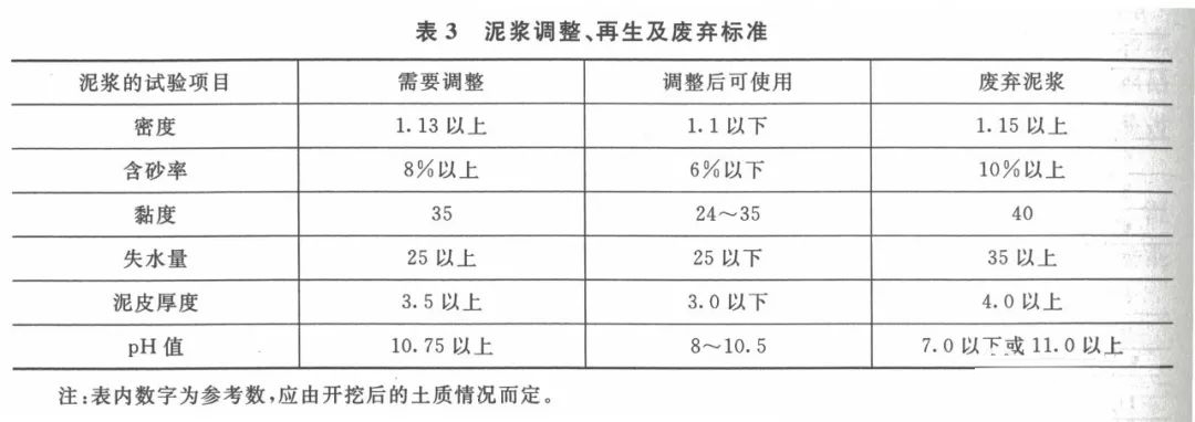(3)混凝土置换出的泥浆,应进行净化调整到需要的指标,与新鲜泥浆混合循环使用,不可调净的泥浆排放到废浆池,用泥浆罐车运输出场。泥浆调整、再生及废弃标准见表。