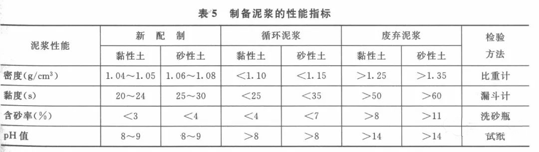 (3)拌制泥浆前,应根据地质条件、成槽方法和用途等进行泥浆配合比的设计,泥浆由泥浆搅拌机高速搅拌6~8min,试验合格后方可使用。制备泥浆的性能指标应符合表5规定。