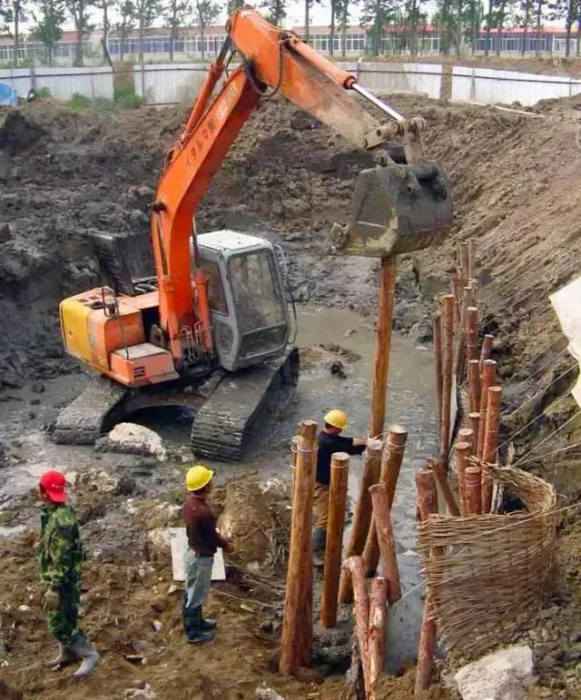 先沿基坑边缘打设柱桩,在柱桩内侧支设挡土板并用斜撑支顶,挡土板内侧填土夯实。适用于深度不大的大型基坑使用。