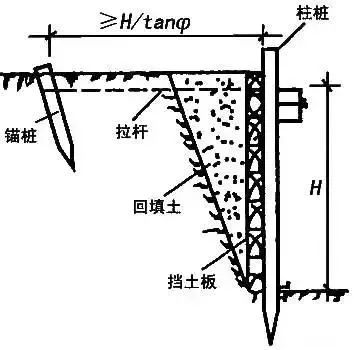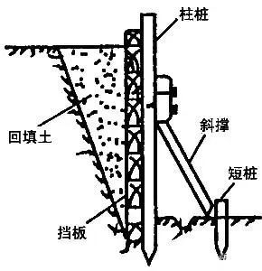 先沿基坑边缘打设柱桩,在柱桩内侧支设挡土板,柱桩上端用拉杆拉紧,挡土板内侧填土夯实。适用于深度不大、不能安设横(斜)撑的大型基坑使用。