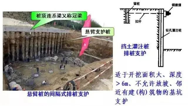 开挖前在基坑周围设置砼灌注桩,桩的排列有间隔式、双排式和连续式,桩顶设置砼连系梁或锚桩、拉杆。施工方便、安全度好、费用低。