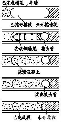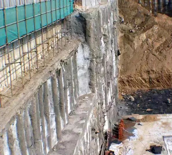 先建造钢筋砼地下连续墙,达到强度后在墙间用机械挖土。该支护法刚度大、强度高,可挡土、承重、截水、抗渗,可在狭窄场地施工,适于大面积、有地下水的深基坑施工。