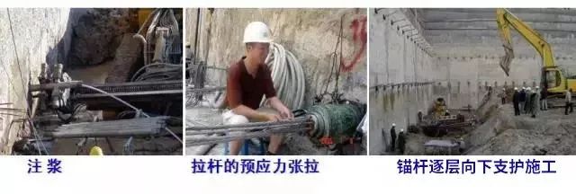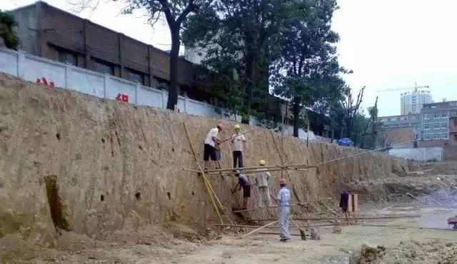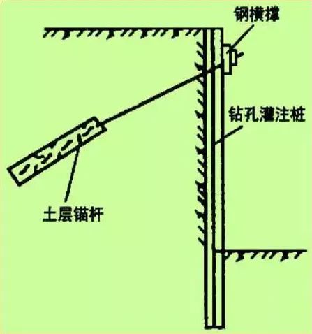 桩顶不设锚桩、拉杆,而是挖至一定深度,每隔一定距离向桩背面斜向打入锚杆,达到强度后,安上横撑,拉紧固定,在桩中间挖土,直至设计深度适于大型较深基坑,施工期较长,邻近有建筑物,不允许支护、邻近地基不允许有下沉位移时使用。