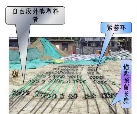包括下料、除锈防腐、焊接导向锥、绑扎、入孔六个步骤。拉杆常用钢管、粗钢筋或钢丝束、钢绞线制成的锚索。锚索预留长度为1- 1.5m,锚固段间隔1-2m设置隔离架和紧箍环,中心布置灌浆管;自由段外套塑料管,前端切实作好隔浆措施。