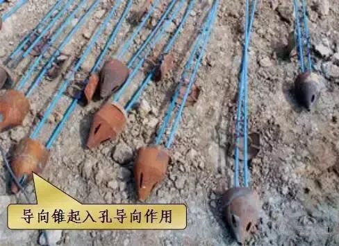 1)造孔:包括钻机就位、施钻成孔、清孔三个作业步骤。造孔用冲击式钻机、旋转式钻机或旋转式冲击钻机,偏心钻机跟进护壁套管方式钻进,造孔须干钻,严禁水钻;考虑沉渣厚度,孔底应超钻30~50mm;成孔后高压风清洗孔壁,以保证砂浆与孔壁的粘结力。