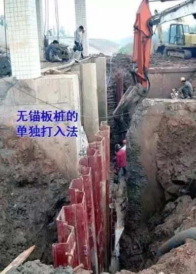 当基坑较深、地下水位较高且未施工降水时,采用板桩作为支护结构,既可挡土、防水,还可防止流砂的发生。板桩支撑可分为无锚板桩(悬臂式板桩)和有锚板桩。常用的钢板桩为U型钢板桩,又称拉森钢板桩。