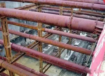 钢管支撑一般采用Φ609钢管,用不同壁厚适应不同的荷载。钢管支撑的形式为对撑或角撑,对撑的间距较大时,可设置腹杆形成桁架式支撑。