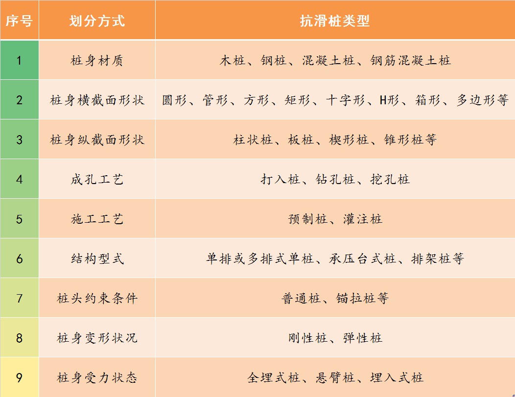 实际工程应用中,应根据滑坡类型及规模、地质条件、滑床岩土性质、施工条件和工期要求等因素具体选择适宜的桩型。
