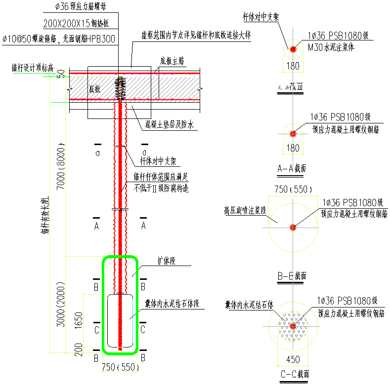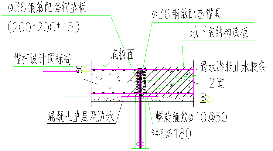 锚杆外用∅10@50螺旋箍,箍筋上部垫∅36钢筋配套钢垫板。垫板规格为200*200*15。垫板上部套上∅36钢筋配套锚具。