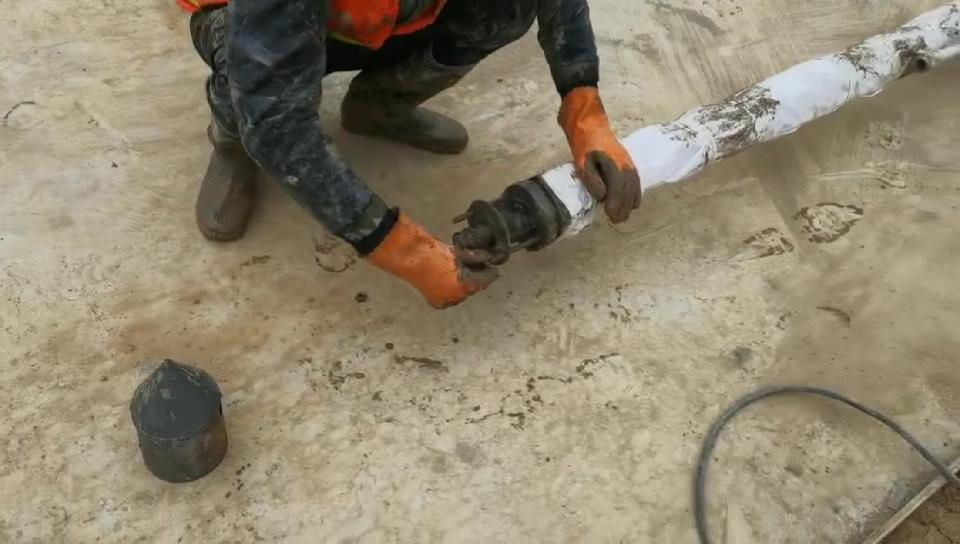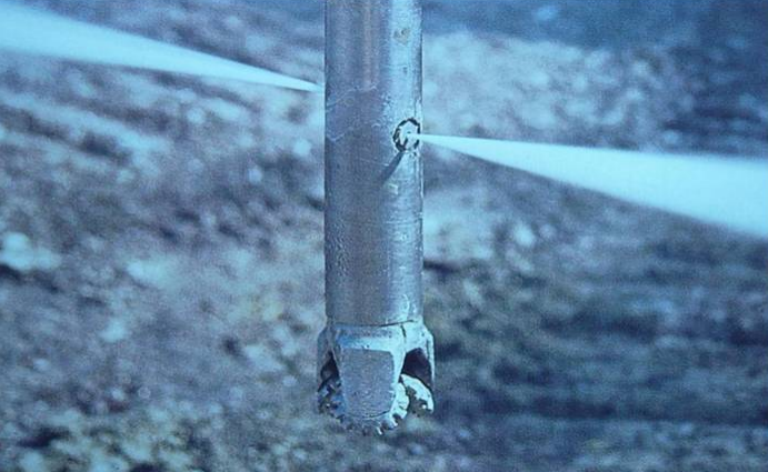 钻孔完成以及锚杆组装完成后准备下放,采用旋喷钻机附配吊装系统,将现场已组装好的扩体锚杆及时迅速地安放到锚孔中。下锚过程中,应尽可能匀速将其下放至设计深度;当遇到下放困难时,可采用下冲法辅助锚杆下放;如果仍无法下放到设计深度,可采用再次复喷方式进行二次引孔。