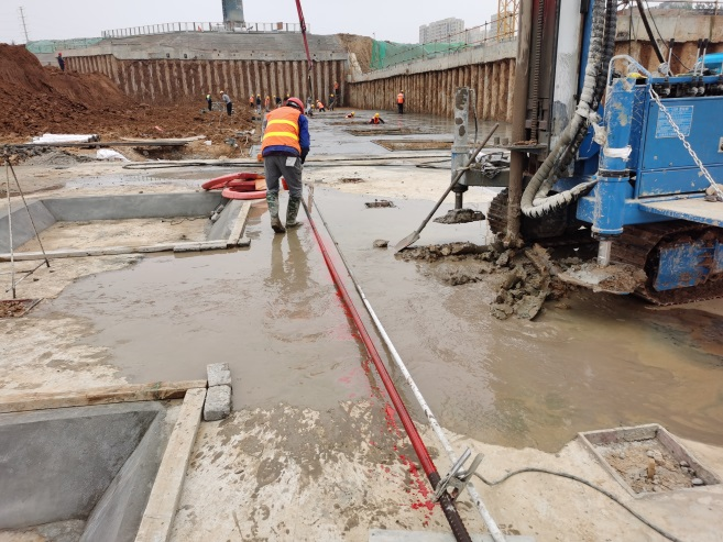 扩径段直径750(500)mm,扩径采用素水泥浆,水泥采用P.0.42.5的普通硅酸盐水泥;水泥用量,按照设计图纸执行;水泥浆水灰比1.0,扩孔喷射压力不小于30MPa,喷射时喷管匀速旋转,匀速扩孔2遍。