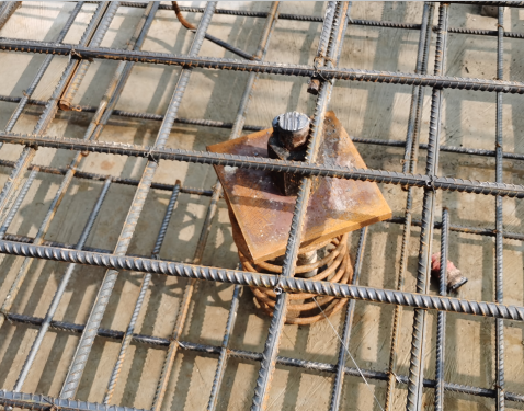 在绑扎板底钢筋之前,套上一道遇到膨胀止水条。套上箍筋时在锚杆中部再套上一道雨水膨胀止水条。以防止锚杆与底板相交处可能出现渗水情况。