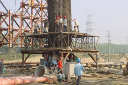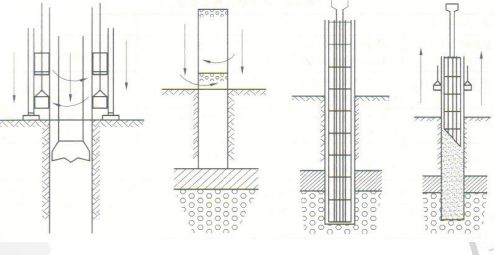 ●灌注桩施工是先用人工或机械在土中做成桩孔,然后再把桩身钢筋笼放入桩孔中,向孔中灌注混凝土而成桩,最后在桩顶浇筑系梁或承台。若用人工开挖桩孔则称为挖孔桩,若用机械挖孔称为钻孔桩。