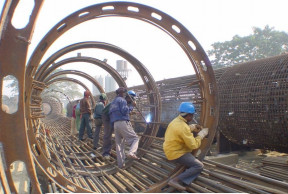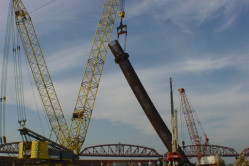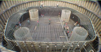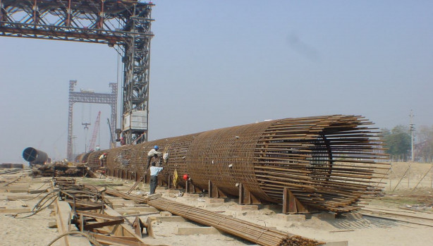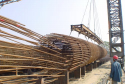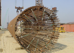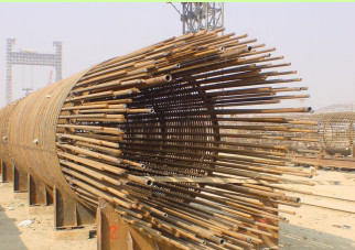桥墩桩钢筋笼长度94.5m,钢筋笼重量约150t主筋φ36mm,箍筋φ20mm。部分断面为双层钢筋笼,同一断面钢筋数量最多达240根,钢筋密集。