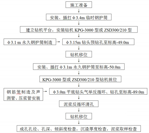 钻孔时采用反循环的方法,其泥浆循环过程为:新制泥浆→泥浆池→桩孔→泥浆净化→桩孔→钻孔结束→泥浆池。