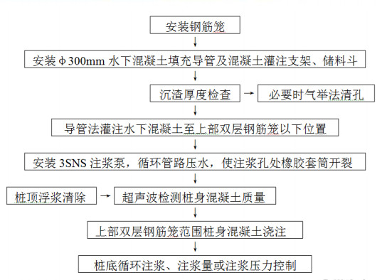 从永久钢护筒底口钻孔开始至混凝土填充至永久钢护筒底口不得超过73小时(39m桩长)。孔底沉碴厚度:孔底至少50%横截面上沉碴厚度<15mm,孔底截面任何位置沉碴厚度≯40mm。桩底压浆:为了钢筋笼底部的压浆管路尽可能贴近孔底而又不被损坏,在钢筋笼底部安装有触底指示灯开关。