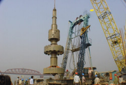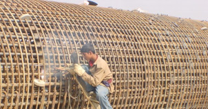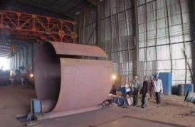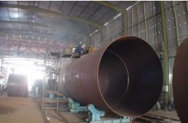 桥墩钢护筒直径3.0m,长52m,板厚25mm。护筒在钢结构厂制造,用卷板机成型,在旋转胎架上用自动电焊机焊接。一般分为四节出厂,用平板拖车或牵引车运输到现场。现场采用手工焊拼接,所有焊缝都要经过超声波探伤检查。