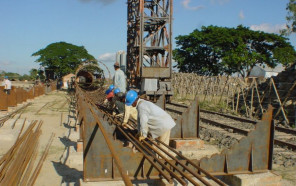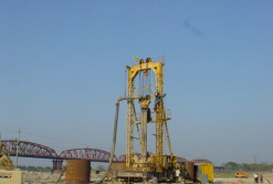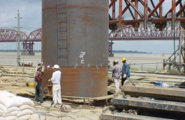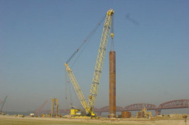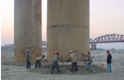 桥址处地质条件为粉、细、中、粗砂层及少量砂砾层。桥梁基础为混凝土钻孔灌注桩,每桥墩为4根φ3.0m钻孔桩,横桥向桩距10.0m,顺桥向桩距9.0m,桩长91.0m。考虑到雨季时河床冲刷严重,钻孔桩上部有钢护筒,桥墩桩钢护