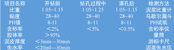泥浆同时起到护壁(平衡孔内水压力),防止坍孔和浮碴的作用。泥浆由黏土或膨胀土加外加剂组成,泥浆比重一般在1.1~1.3间。