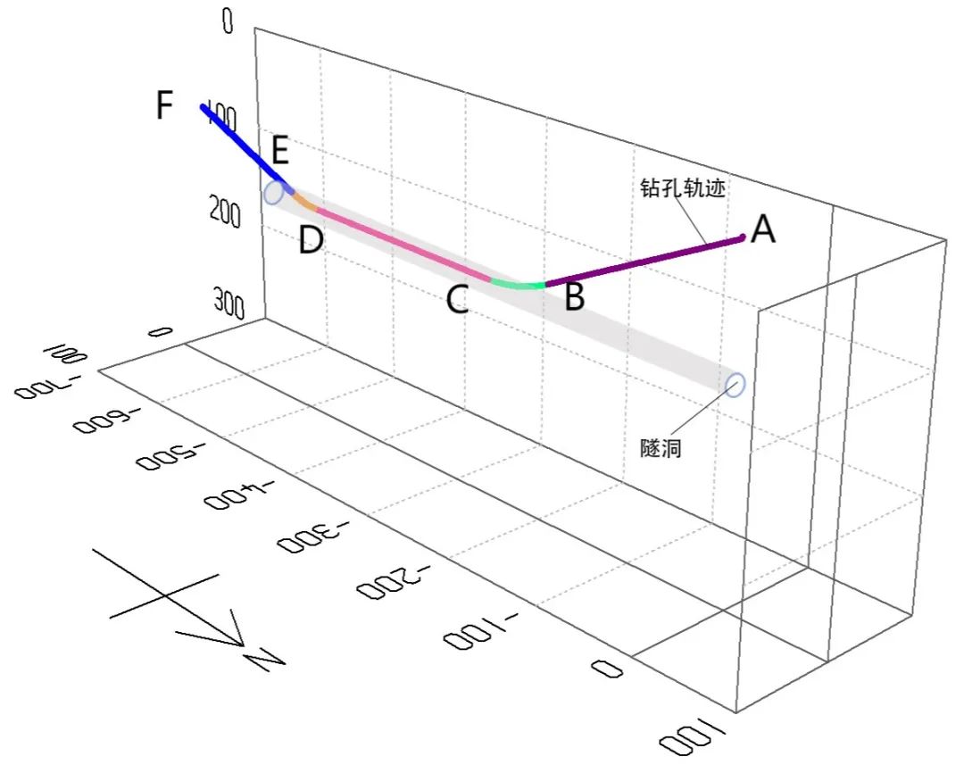 各段长度如下:AB直线段长219m,BC变轨段长75m,CD水平直线(沿隧洞轴线)段长228m,DE变轨段长90m,EF尾段长15m,合计轨迹路线长度627m,投影长度600.2m,为超深复合定向钻孔。