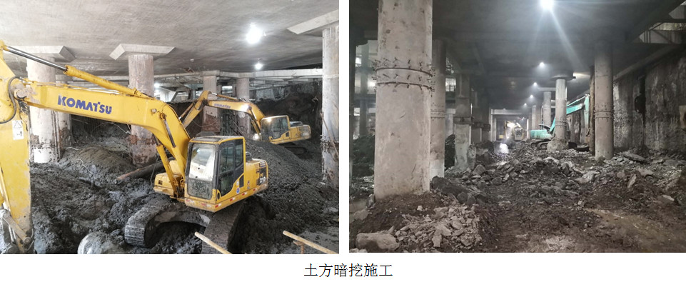 (2)土方暗挖挖机设备容易碰撞钢柱、预留插筋等,且闹市区土方开挖限时,夜间土方外运受城管堵门等影响,出土时间基本为凌晨12点以后,有效出土时间为5h,逆作法土方开挖难度和进度压力极大。