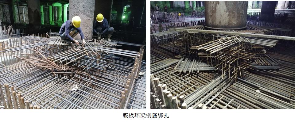 底板钢筋工程量大,且由于前期已封闭两个取土口,塔吊无法吊运材料,大量钢筋需通过人工从取土口位置搬运至现场进行安装。另有超过65%的钢柱与底板之间设置了环梁节点,且节点构造复杂,钢筋数量多,施工难度极大,工效极低。