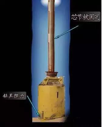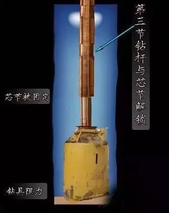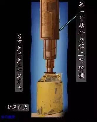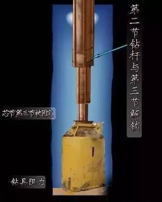 解锁第3步骤:当芯节和第三节被钻斗阻力固定,第二节与第三节解锁。
