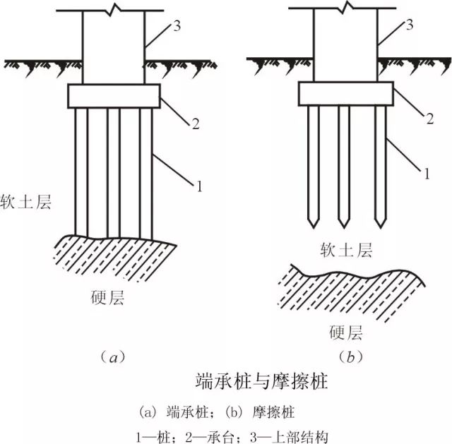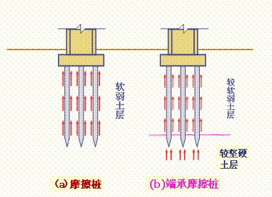 ①端承桩是穿过软弱土层而达到坚硬土层或岩层上的桩,结构荷载主要由岩层阻力承受;施工时以控制嵌岩深度为主,对沉渣厚度的要求严格。——桥梁工程中的端承桩多数要求嵌岩。②摩擦桩完全设置在软弱土层中,依靠桩端阻力和桩身侧面与地基土之间的摩擦阻力共同承受荷载,施工时以控制桩端设计标高(长度)为主。——对于桩端为硬土层者,又有摩擦端承桩,端承摩擦桩。——桥梁工程中的摩擦桩,通常不计挤密作用。