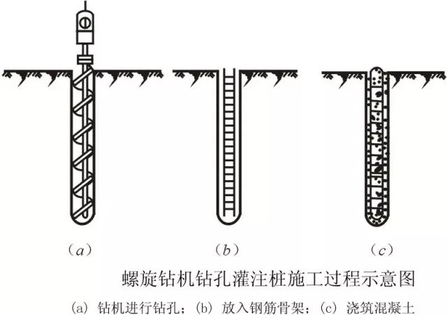 灌注桩是在桩位处成孔,然后放入钢筋骨架,再浇筑混凝土而成的桩。灌注桩按成孔方法不同,有钻(冲)孔灌注桩、挖孔灌注桩、套管成孔灌注桩及爆扩成孔灌注桩等。
