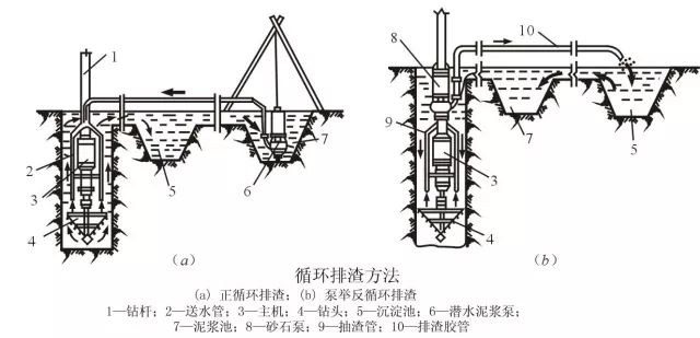 回旋钻机成孔排渣有正循环排渣和反循环(泵举)排渣两种方式。